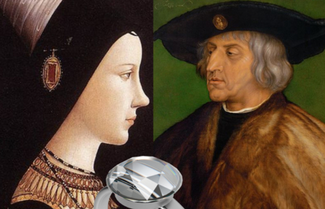 Archduke Maximillian of Austria presents Mary of Burgundy with a diamond engagement ring.